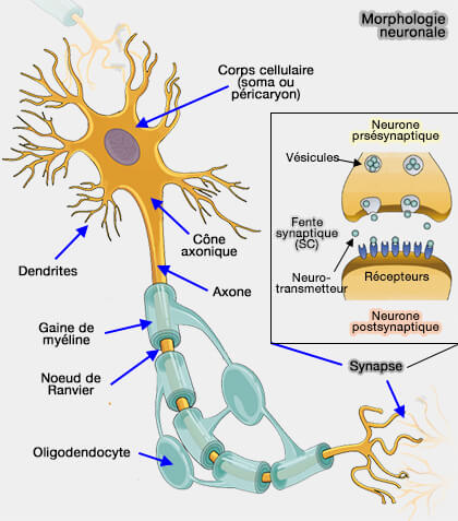 Les neurones sont en contact avec des boutons synaptiques et, grâce aux chémorécepteurs présents sur leur membrane, ils collectent des informations en provenance d'autres neurones.