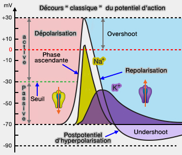 Le signal électrique, le potentiel d'action, est déclenché quand le potentiel synaptique global atteint un certain seuil : les électrorécepteurs sodium et potassium sont alors à la manœuvre ( mouvements ioniques lors du potentiel d'action).