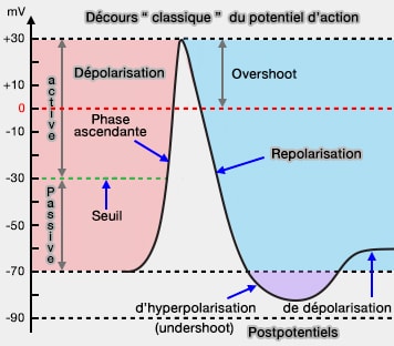 soit on observe une inversion de potentiel (comme ici), et la partie du décours pendant laquelle la valeur du potentiel est positive est appelée " overshoot ".