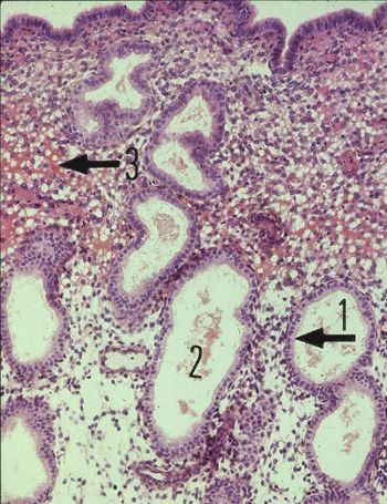 L'endomètre s'épaissit par des intenses mitoses (3) dans le stroma.