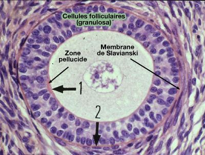 La zone pellucide est traversée par des prolongements cytoplasmiques des cellules folliculaires.