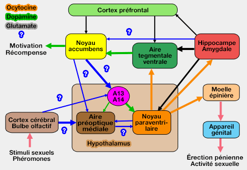 L'OT agit directement ou indirectement (via l'acide glutamique sur les neurones dopaminergiques (cf. figure). Cet effet proérectile est sous la dépendance de la testostérone.