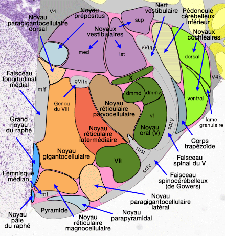 Les fibres du nerf vestibulaire pénètrent au niveau bulbo-pontique (à la hauteur du noyau vestibulaire latéral de Deiters).