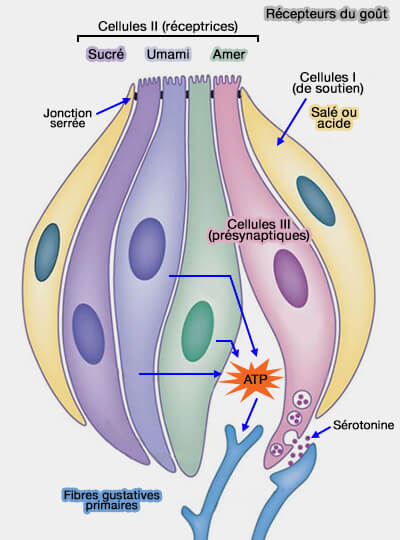 - Elles contiennent les récepteurs et la machinerie de transduction pour les stimuli gustatifs amers, sucrés et umami (