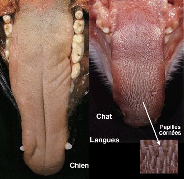 Chez le chat, la langue est plus courte et plus large, proportionnellement. Elle est plate, dépourvue de sillon central.