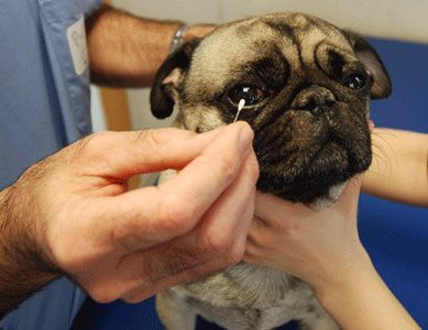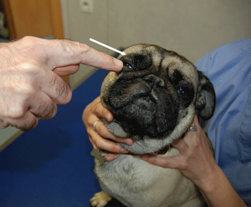 On approche brusquement le doigt vers l'oeil de l'animal, sans toucher ni le globes oculaire ni les structures extra-oculaires (cils, poils…).