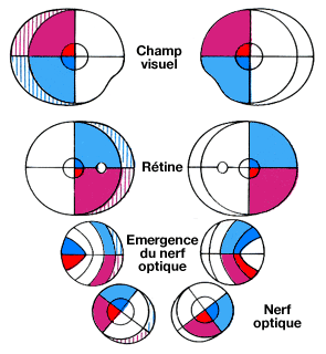 (décussation) et celles des régions temporales demeurent du