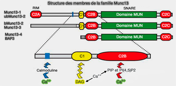 Cette interaction libère le domaine Hc de la syntaxine du complexe Munc18/syntaxine pour former le complexe ternaire syntaxine-1/SNAP-25/VAMP2 qui favorise la fusion des VS (Munc13 activates the Munc18‐1/syntaxin‐1 complex and enables Munc18‐1 to prime SNARE assembly 2020).
