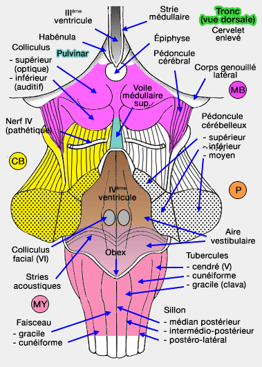 Le bulbe rachidien (ou moelle allongée) est la partie la plus caudale du tronc cérébral qui fait suite à la moelle épinière, et est formé, comme elle, de substance grise entourée de faisceaux de substance blanche.