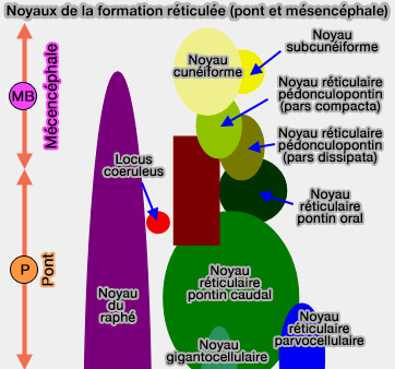 médialement par les noyaux du raphé (magnus, pontin, médian) et le noyau réticulaire tegmental pontin,