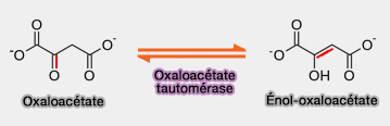 À pH élevé, le proton énolisable devient également ionisé, passage de l'ion oxaloacétate à l'ion énol-oxaloacétate et les formes tautomères sont stables :