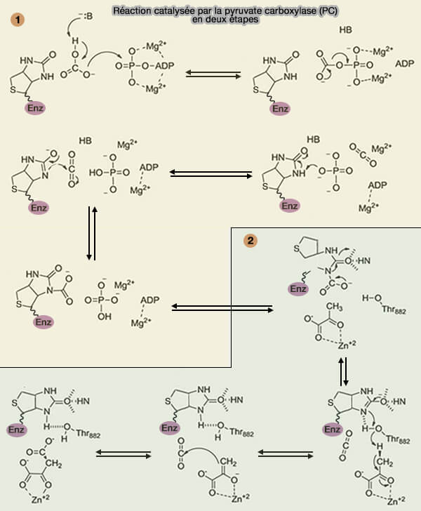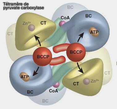 (Figure : vetopsy.fr d'après Adina-Zada et coll) - La biotine est ainsi éloignée de la BCCP pour être positionnée à proximité du pyruvate dans le site actif CT.