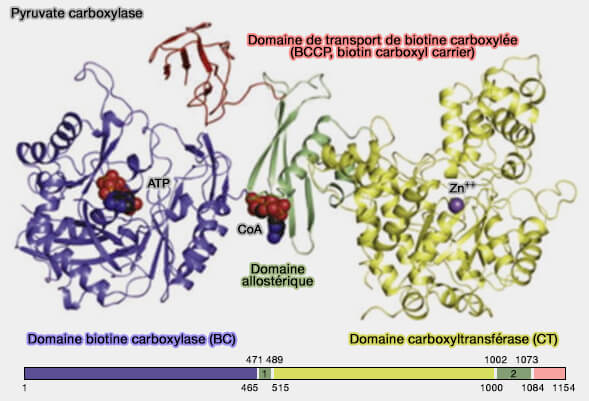 La PC, enzyme à domaine prosthétique constitué de biotine qui est attachée par une liaison amide ($\ce{-C(=O)N-}$) à un résidu lysine dans le domaine de transport, comprend quatre domaines (Structure, Mechanism and Regulation of Pyruvate Carboxylase 2008).