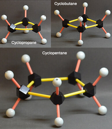 Dans les composés cycliques, la fermeture de la chaîne sur elle-même ne permet pas de maintenir l’angle à la valeur optimale de 109° 28’’ pour le carbone tétrahédrique (conformations des cycloalcanes), et empêche les rotations de 360° autour de chaque carbone.