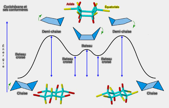 - deux formes chaises - chaise et chaise inverse - (tous les substituants sont décalés), les plus stables, qui sont des conformations dites rigides ; toutes les autres sont dites flexibles.