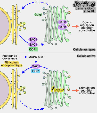 - Après la stimulation des facteurs de croissance, l'activité MAPK P38 est sollicitée pour dissocier les complexes SAC1, ce qui enclenche le trafic rétrograde et la redistribution de SAC1 dans le réticulum endoplasmique. La réduction du SAC1 au niveau du Golgi augmentent la concentration de PI(4)P et accélère la sécrétion constitutive.