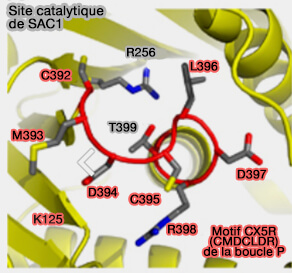 1. Le centre catalytique Sac1 est différent des motifs CX5R classiques, ici CMDCLDR(/T/S), comme celui de PTEN ou des myotubularines (Crystal structure of the yeast Sac1: implications for its phosphoinositide phosphatase function 2010).