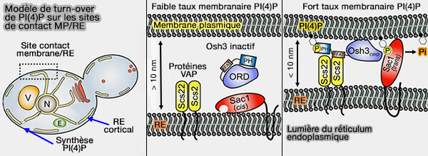 - Osh3, par son domaine PH, Osh3 se localise sur les sites de contact membranaire RE/MP en fonction des niveaux de PI(4)P membranaire et activerait Sac1.