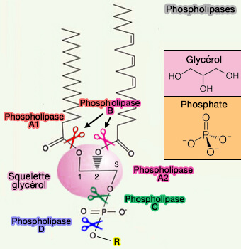 Les phospholipases sont des enzymes qui hydrolysent les phospholipides en acides gras et en autres corps lipophiles.