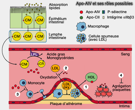 - La surexpression de l'apoA-IV provoque une forte augmentation de la sécrétion de triglycérides (TG), d'esters de cholestérol et de phospholipides (PL) dans les particules de chylomicrons (Overexpression of Apolipoprotein A-IV Enhances Lipid Transport in Newborn Swine Intestinal Epithelial Cells 2002).