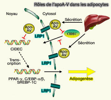 L'apoA-V pénètre dans les adipocytes, où il se co-localise avec la périlipine autour des gouttelettes lipidiques pour empêcher le stockage des TG.