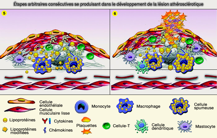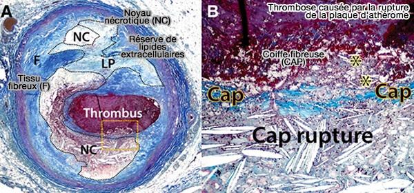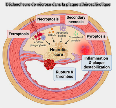 La nécrose des cellules de la plaque contribue à la vulnérabilité de la plaque en libérant des médiateurs pro-inflammatoires comme IL1α, des MMP (Matrix MetalloProteinases) et des facteurs thrombogènes (par exemple, le facteur tissulaire).
