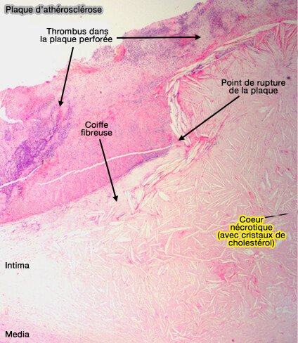 La plaque fibro-lipidique d'athérosclérose se calcifie, devient instable et se rompt.