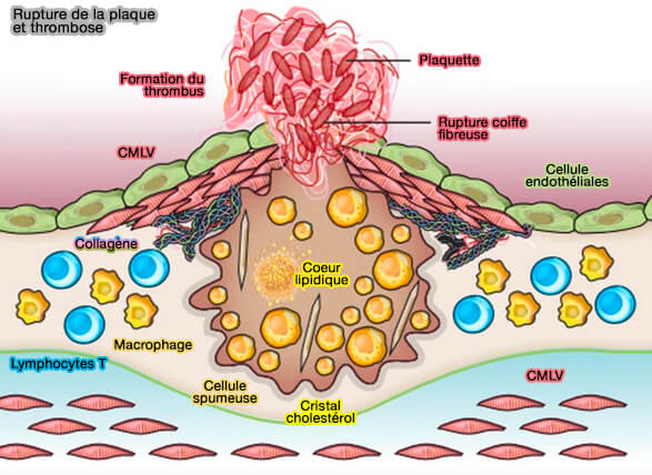2. Ces processus exposent l'intérieur de la plaque prothrombotique et un contact direct entre les facteurs tissulaires et les plaquettes circulantes, entraînent une thrombose par une agrégation plaquettaire, accélérée par les neutrophiles.