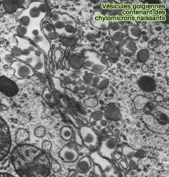 MTTP (Microsomal Triglyceride Transfer Protein), qui effectue l'étape de lipidation dans le RE, a été aussi retrouvé dans le Golgi (Localization of Microsomal Triglyceride Transfer Protein in the Golgi: possible role in the assembly of chylomicrons 2002).