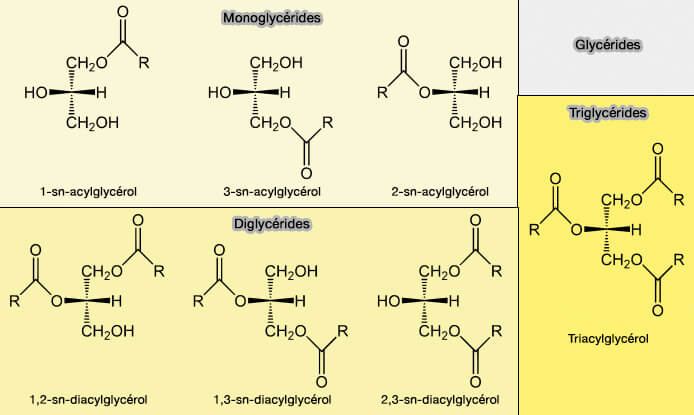 Les glycérides, acylglycérides ou acylglycérols, à base de glycérol, dont l'un ou les groupes alcool ($\ce{R-OH}$)) sont estérifiés $\ce{-C(=O)-O-}$ par des acide gras.