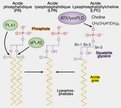 a. Dans la circulation, la source la plus importante d'acide lysophosphatidique est la lysophosphatidylcholine (LPC ou LysoPC), i.e. 1-acyl-sn-glycero-3-phosphocholine par l'action de l'autotaxine (ou ectonucleotide pyrophosphatase/phosphodiesterase family member 2, i.e. E-NPP 2), enzyme de type phospholipase D qui produit principalement du LPA sous une forme liée à l'albumine.