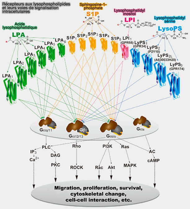 Les sous-unités Gα (Gα12/13, Gαq/11, Gαi/o et GαS) sont utilisées par les récepteurs LPA pour la signalisation, activant ainsi différentes voies en aval sous divers environnements et types de cellules et produisan.t des résultats divergents.