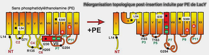 La PE, phospholipide non chargé, pourrait neutraliser la localisation des acides aminés négatifs du côté cytoplasmique des domaines transmembranaires, ce qui augmenterait le potentiel de charge positive effectif.