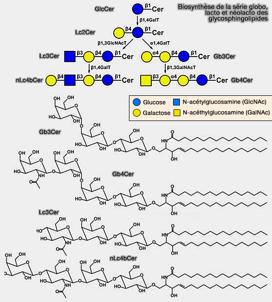 2. Le principal globoside trouvé dans les érythrocytes humains est un tétrahexoside (GalNAcβ1-3Galα1-4Galβ1-4Glcβ-Cer), souvent abrégé en Gb4Cer ou GbOse4Cer, i.e. appelé globoside car il a d'abord été obtenu sous forme de précipité globulaire biréfringent et a donné le nom de la série globo.