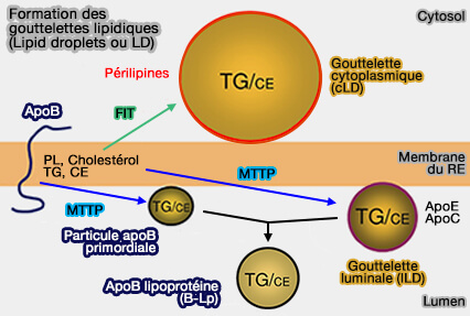 soit dans le cytoplasme, pour former des gouttelettes lipidiques cytoplasmiques (cLD) libres,