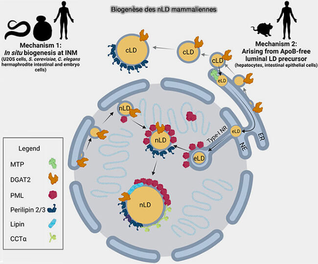 La biogenèse des gouttelettes lipidiques nucléaires (lLD) s'effectuerait selon deux mécanismes.
