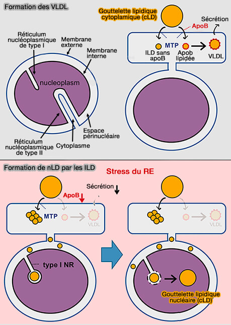 Les gouttelettes lipidiques nucleaires (nLD) ne sont pas des cLD piégées dans le noyau, mais bien de véritables organites dotés de leurs propres caractéristiques et leur biogenèse s'effectuerait selon deux processus.