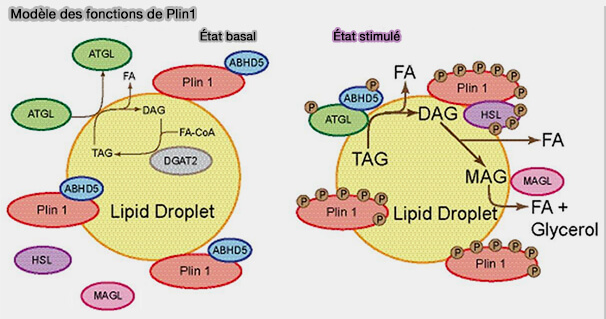 1. D'une part, l'extrémité C-terminale de Plin1a non phosphorylée interagit avec CGI-58/ABHD5 l'activateur de l'ATGL, limitant ainsi l'activité lipolytique cellulaire.