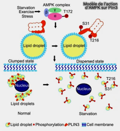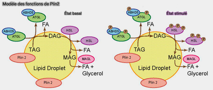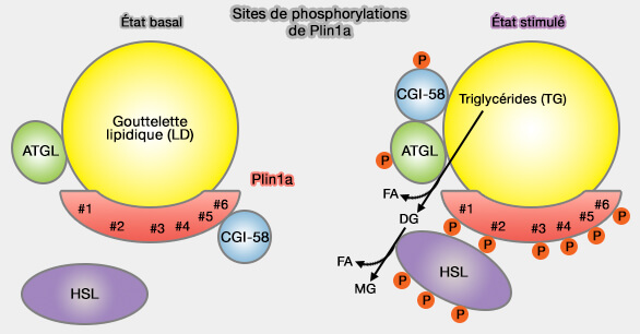 Dans ces conditions, Plin1, CGI-58/ABHD5 et ATGL, ainsi qu'HSL sont phosphorylées par la PKA avec pour conséquence une réorganisation de l'échafaudage des cLD qui est essentielle pour l'activation massive de la lipolyse, i.e. plus de 50 fois.