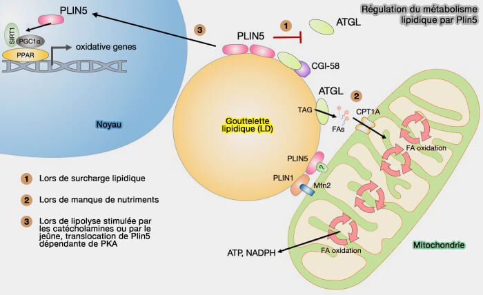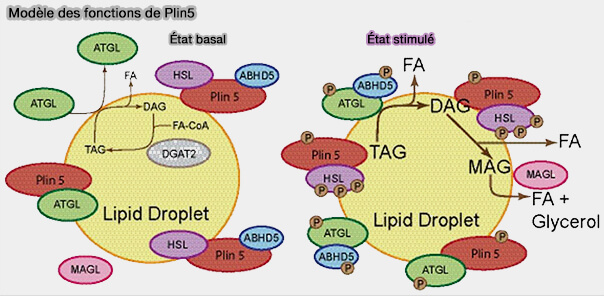 Plin5 diminue l'hydrolyse des cLD dans les tissus oxydatifs, i.e. cœur, muscle squelettique et foie, avec Plin2, et tissu adipeux brun avec Plin1, mais le mécanisme est encore à clarifier.