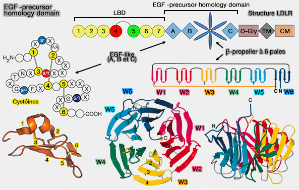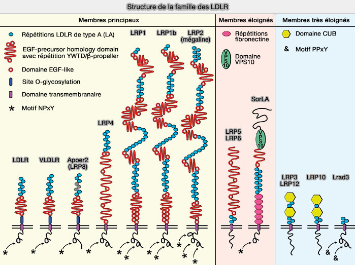 Remarque : LDLR, apoER2 et VLDLR contiennent en outre un domaine d'O-glycosylation (OLSD ou O-Linked Sugar Domain) localisé juste au-dessus du feuillet externe de la membrane plasmique.