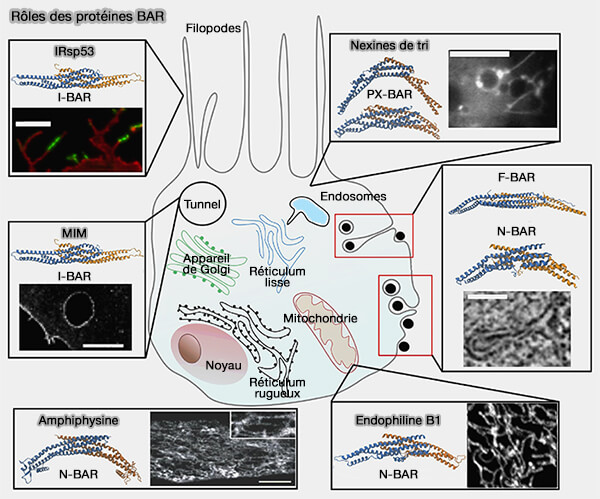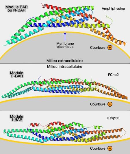 Les domaines BAR classiques ont une affinité pour les membranes fortement courbées positivement et sont contenus dans plusieurs protéines.