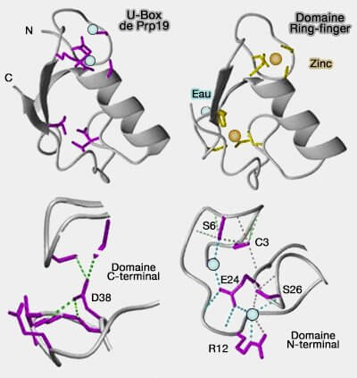a. Les cystéines ou les histidines sont remplacées par des résidus polaires qui interviennent dans des liaisons hydrogène et salines qui maintiennent la structure de la protéine et son activité dans l'ubiquitination (The Prp19 U-box Crystal Structure Suggests a Common Dimeric Architecture for a Class of Oligomeric E3 Ubiquitin Ligases 2008).