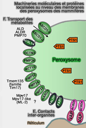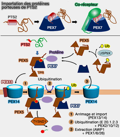 Le peroxysome doit importer des protéines pour les processus via des transporteurs membranaires ( cf. figure au-dessous et détails dans les chapitres correspondants).