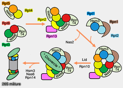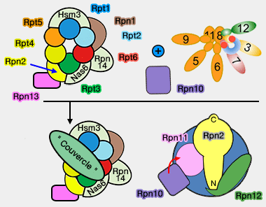 - Il semblerait que les hélices C-terminales des Rpn ordonnent l'ordre d'incorporation des différentes sous-unités (Formation of an Intricate Helical Bundle Dictates the Assembly of the 26S Proteasome Lid 2013).