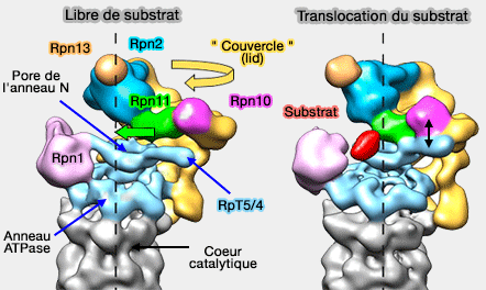 2. Lors du déplacement du " couvercle " dans l'engagement du substrat, Rpn11 se décale de 18 Å, si bien que son site catalytique se positionne face au canal central (Conformational switching of the 26S proteasome enables substrate degradation 2013)
