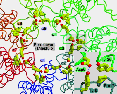 Cela se traduit par la formation d'un complexe de quatre résidus hautement conservés, Tyr8, Asp9, Pro17 et Tyr26, entre chacune des sous-unités adjacentes (A gated channel into proteasome core particle 2000).