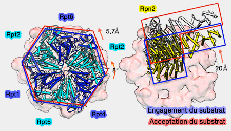 La liaison du nucléotide modifie la rotation entre les grands et les petits domaines AAA+ des Rpt, et expliquent le mécanisme permettant de relier le cycle ATPasique aux changements conformationnels dans l'anneau hexamérique des Rpt, à l'alignement des anneaux et, enfin à la translocation du substrat.