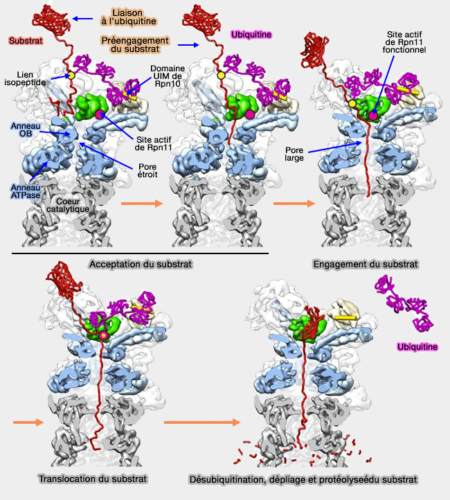 - Il déplie le substrat et clive l'ubiquitine qui peut être alors recyclée (cf. désubiquitination du substrat),