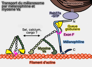 - la myosine Va par la mélanophiline (A Coiled-Coil Domain of Melanophilin Is Essential for Myosin Va Recruitment and Melanosome Transport in Melanocytes 2006 et More Than Just a Cargo Adapter, Melanophilin Prolongs and Slows Processive Runs of Myosin Va 2013).